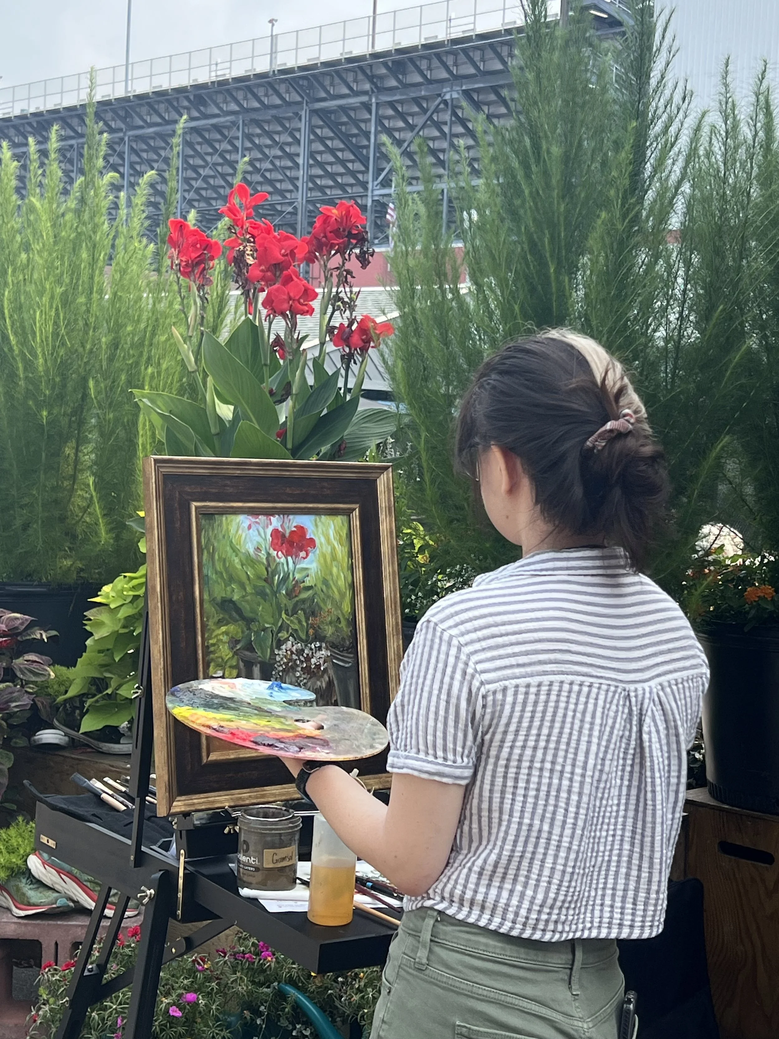 Before your wedding, we will have a conversation via video call, phone, or email to discuss the vision for your painting. On your big day, I will show up early to set up, and take a photo of your desired scene for the painting (or use a photo taken by your photographer if arranged). I will paint at the venue for 6-8 providing entertainment and a one of a kind experience for you and your guests.