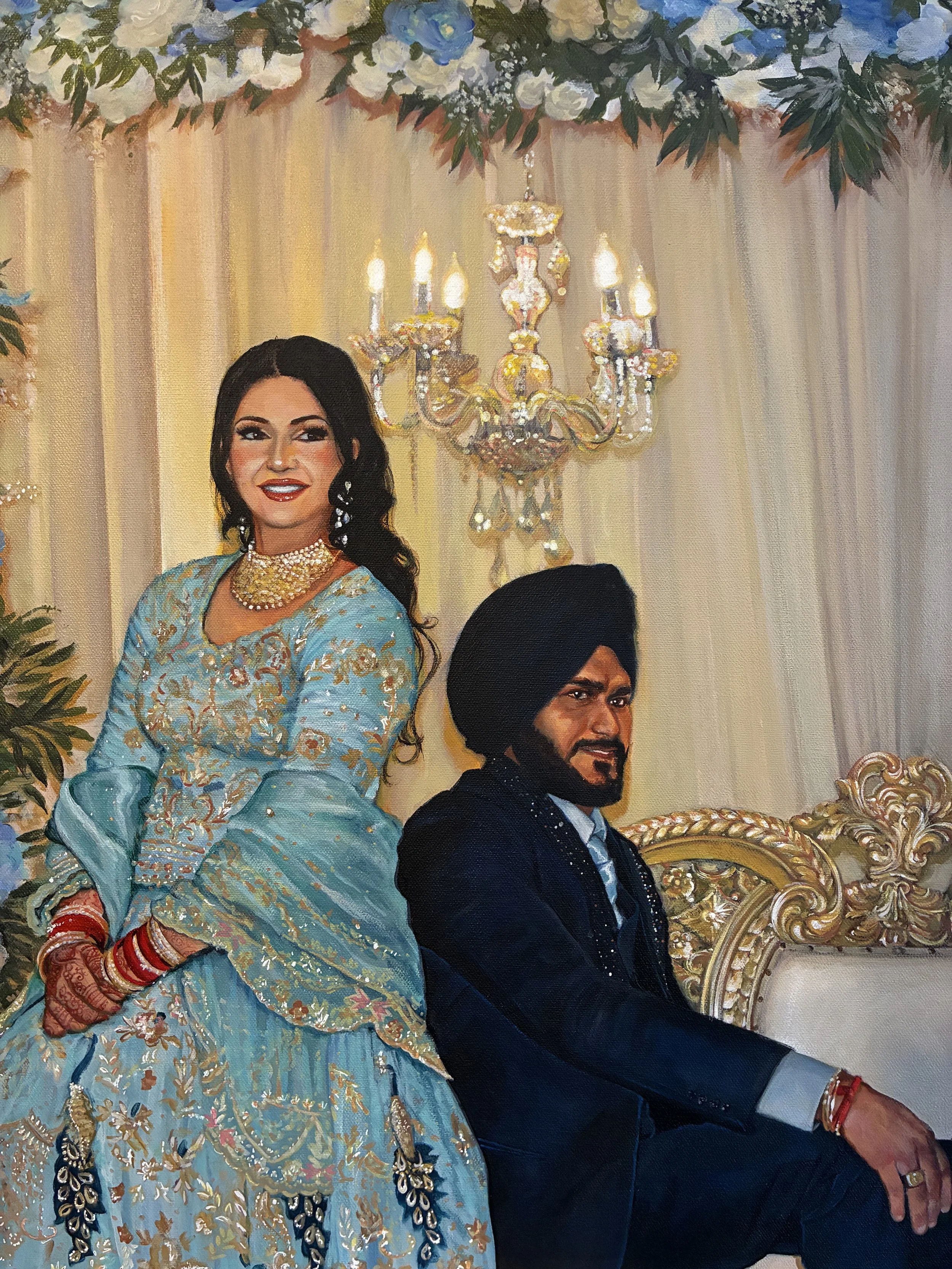 “I basically start sketching with a medium-size brush once I get the desired references at the wedding, doing really basic shapes— simplified forms and masses overall, and then slowly start bringing the bride and groom's figures to life, as much as time allows. it takes another 30+ hours in the studio to complete the painting (or rather 'stop painting"). More than 60% of my time is spent on the background.”